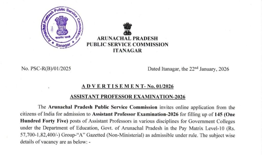 The Arunachal Pradesh Public Service Commission has officially released a notification on January 22, 2026, for appointments to the post of Assistant Professor in various disciplines for Government Colleges under the Department of Education.