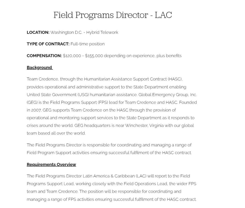 Global Emergency Group seeks a qualified candidate for the Field Program Director position, who will be managing and reviewing tasks under the FPS team. If you are interested in the Field Programs Director position, you can learn the full details here.