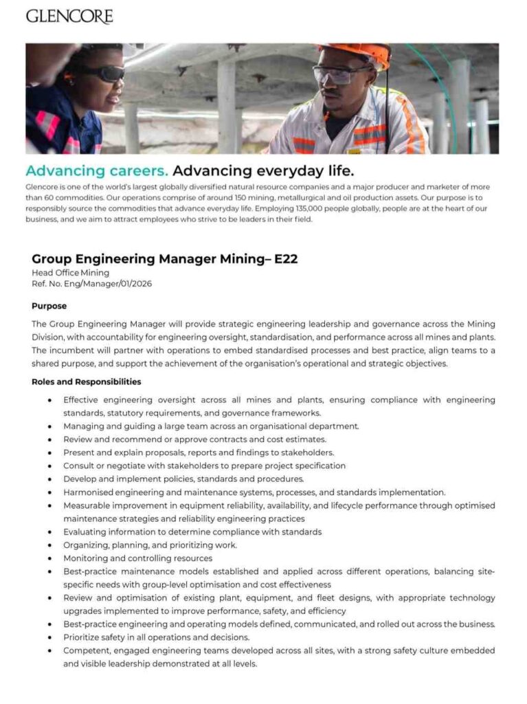 The Glencore Group Engineering Manager Mining-E22 application portal will close in five days, so hurry up if you do not wish to miss this opportunity and work in the dynamic environment of South African mines.