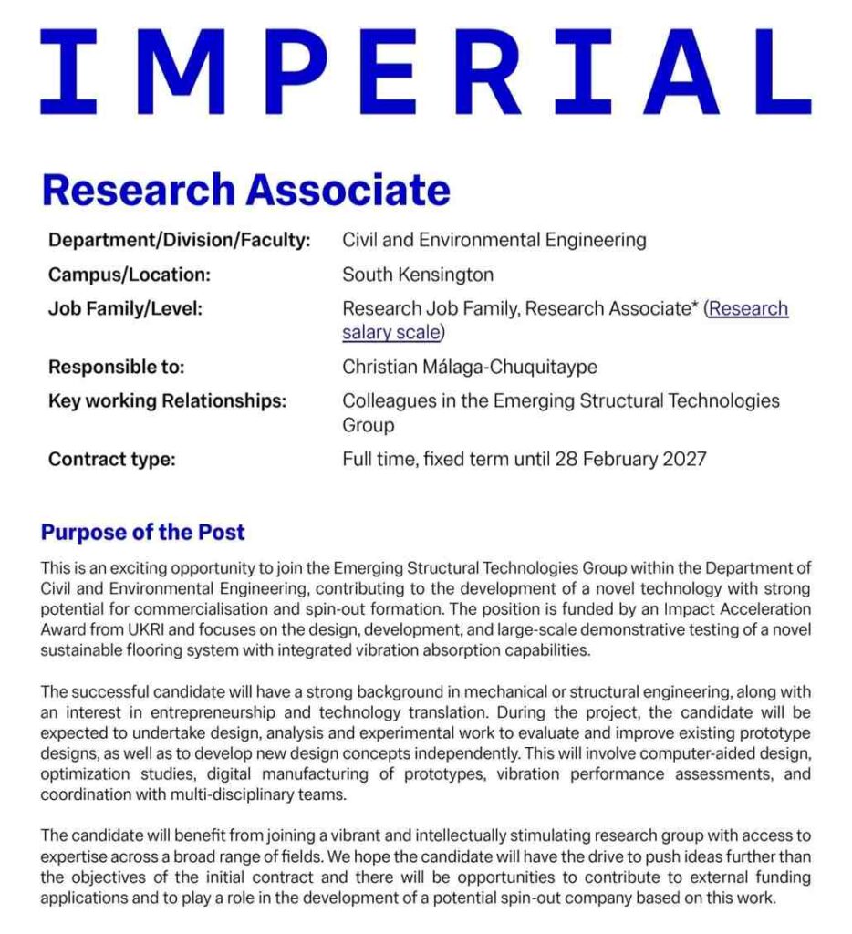 The Department of Civil and Environmental Engineering at Imperial College London has announced a research associate vacancy, presenting a golden opportunity for candidates interested in working on high-impact, industry-relevant research projects focused on sustainable structural systems and vibration monitoring.