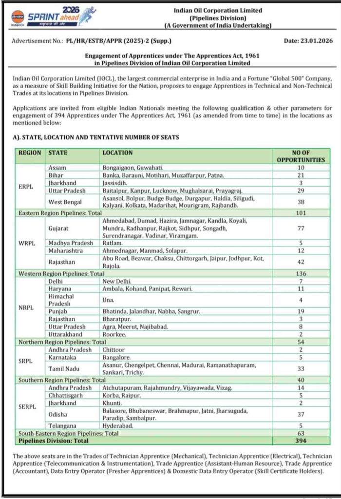 The Indian Oil Corporation Limited has officially released a notification for engagement of Apprentice under its Pipeline Division on different locations. If you are interested in an apprenticeship in any technical or non-technical trade, you may submit your application.