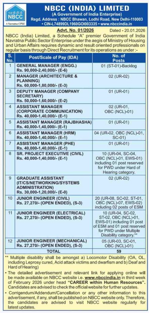 The National Buildings Construction Corporation India Limited has officially released the short notice on January 20, 2026, for the recruitment of different manager, executive, assistant, and engineer positions.