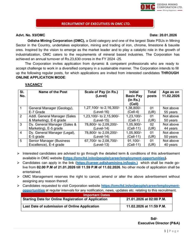 The Odisha Mining Corporation officially released a notification on January 20, 2026, for the recruitment of candidates for five different executive positions and invited applications from those interested in being appointed to any executive positions at OMC.