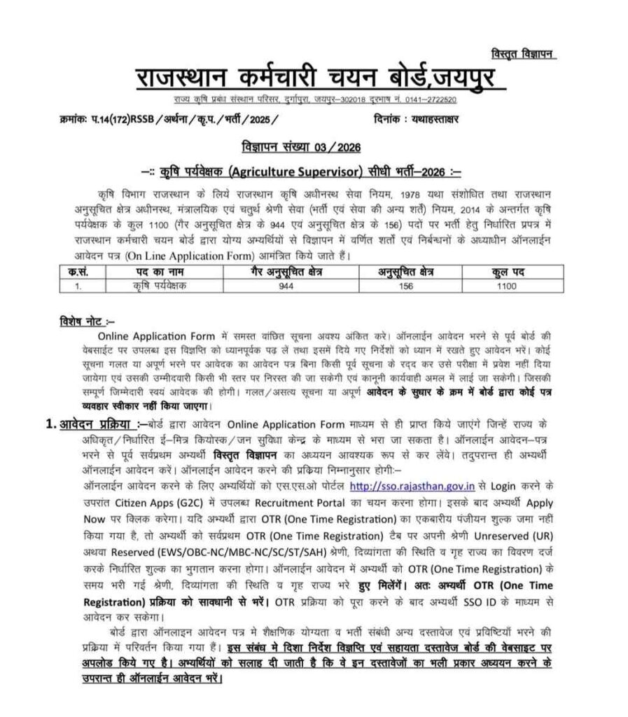 The Rajasthan Staff Selection Board released the notification on January 6, 2026 for the recruitment of Agriculture Supervisor posts under the Department of Agriculture, Government of Rajasthan, and invited eligible and interested candidates to apply through the web-portal.
