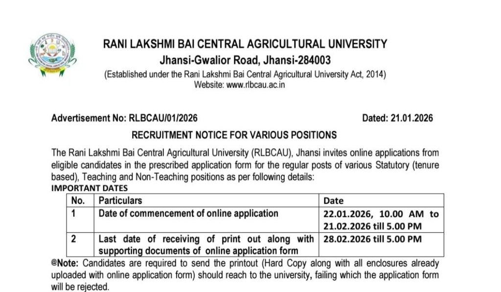 The Rani Lakshmi Bai Central Agricultural University, Jhansi, has officially released a notification on January 21, 2026, for recruitment to various statutory, teaching and non-teaching positions and has invited eligible candidates to apply.