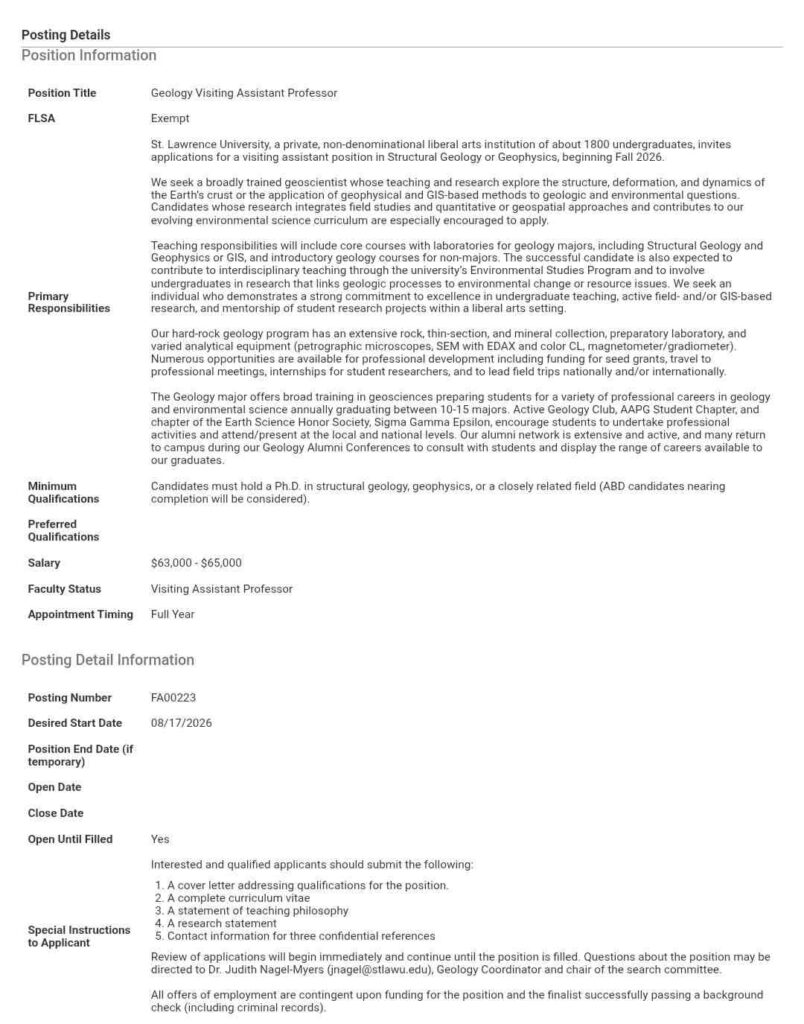 St. Lawrence University Geology Visiting Assistant Professor: Application Process
