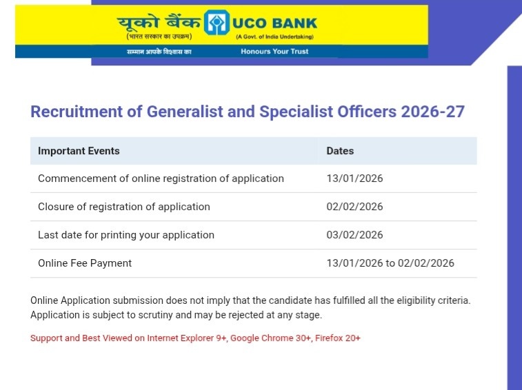 The UCO Bank has officially released a notification on January 13, 2026, for recruitment to various positions under the general and specialist cadre of the bank and has invited applications from eligible and interested candidates.