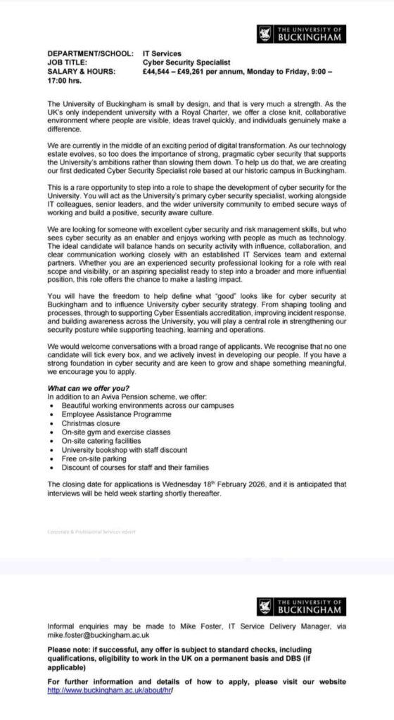 The first Cyber Security Specialist post of University of Buckingham is out. If you meet the criteria and are passionate about cyber security, you should apply before 18 February 2026.