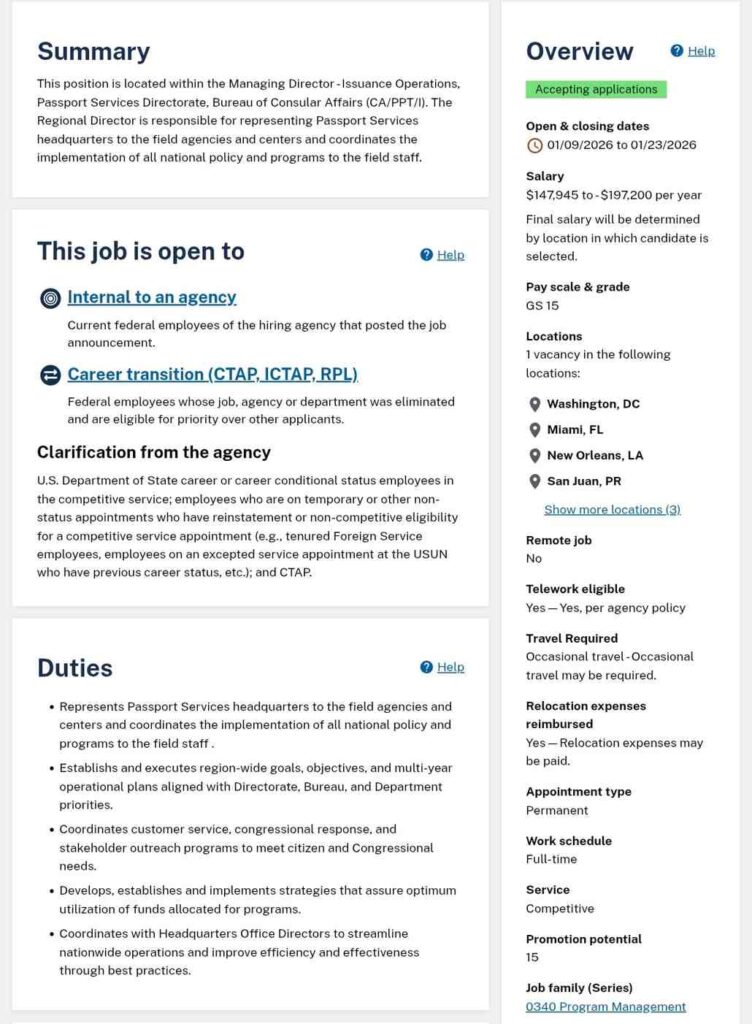 The USA Jobs posted about the Department of State Supervisory Program Manager vacancy, and the application window has been open since 09 January 2026. The post in the Department of State is based within the Managing Director-Issuance Operations, Passport Services Directorate, Bureau of Consular Affairs.